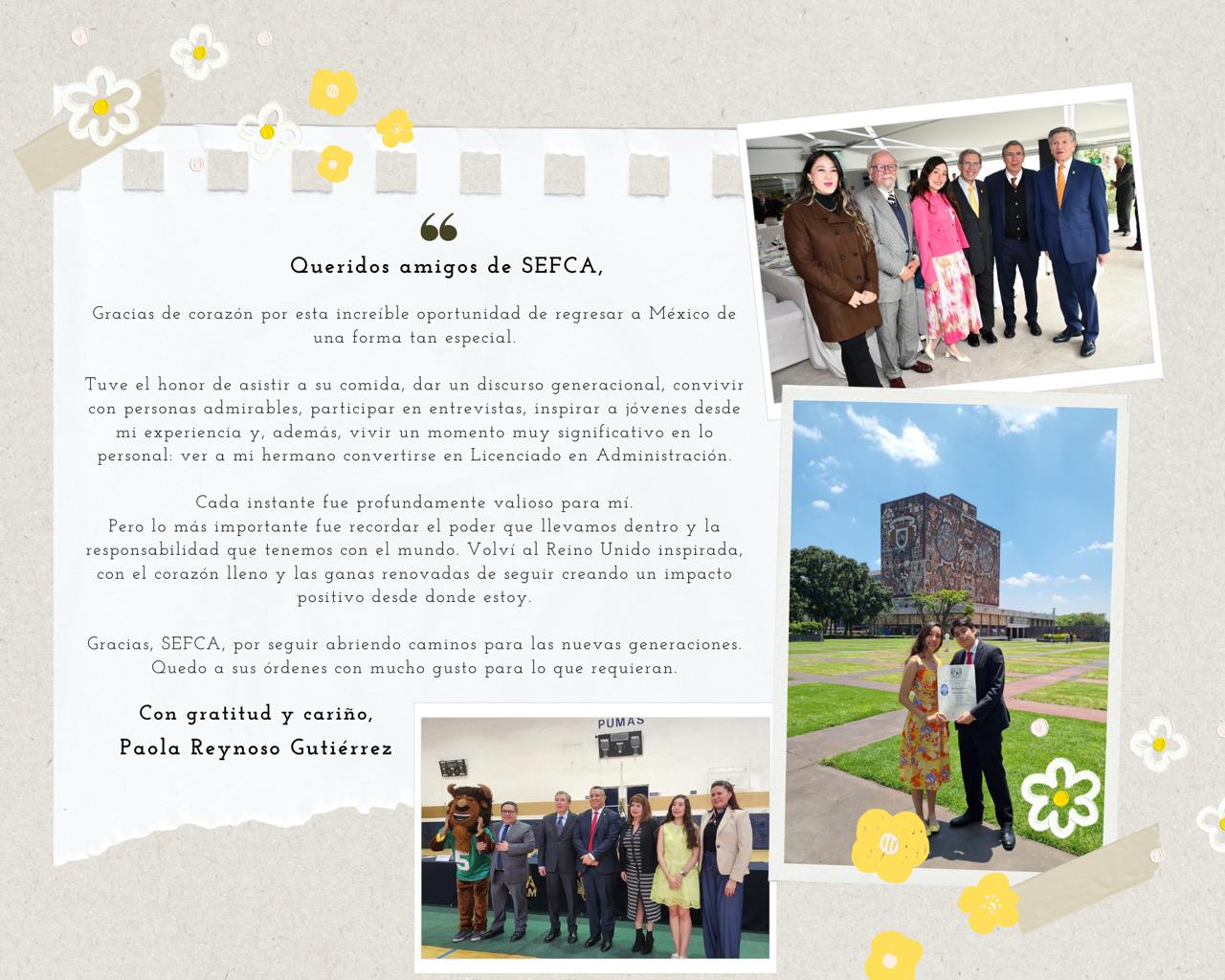 El 8 de junio 2023 , en sesión conjunta del Consejo Directivo y del Consejo Consultivo , presidida por su Presidente Lic.Isaac Chertorivski y por el Director de la FCA , Mtro. Tomás Humberto Rubio Pérez, se hizo entrega de un Diploma SEFCA UNAM a PAOLA REYNOSO egresada distinguida de la FCA, en reconocimiento a que obtuvo el Primer Lugar del Premio Internacional Universia Santander 2023. Igualmente se le designó como Afiliada Honoraria de SEFCA UNAM.